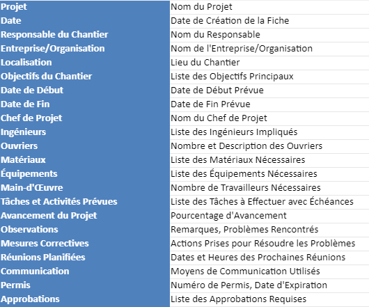 Cette fiche de chantier est un document de référence pour tous les intervenants impliqués dans le projet. Elle doit être mise à jour régulièrement pour refléter l’état actuel du chantier et servir de guide pour les décisions futures.
