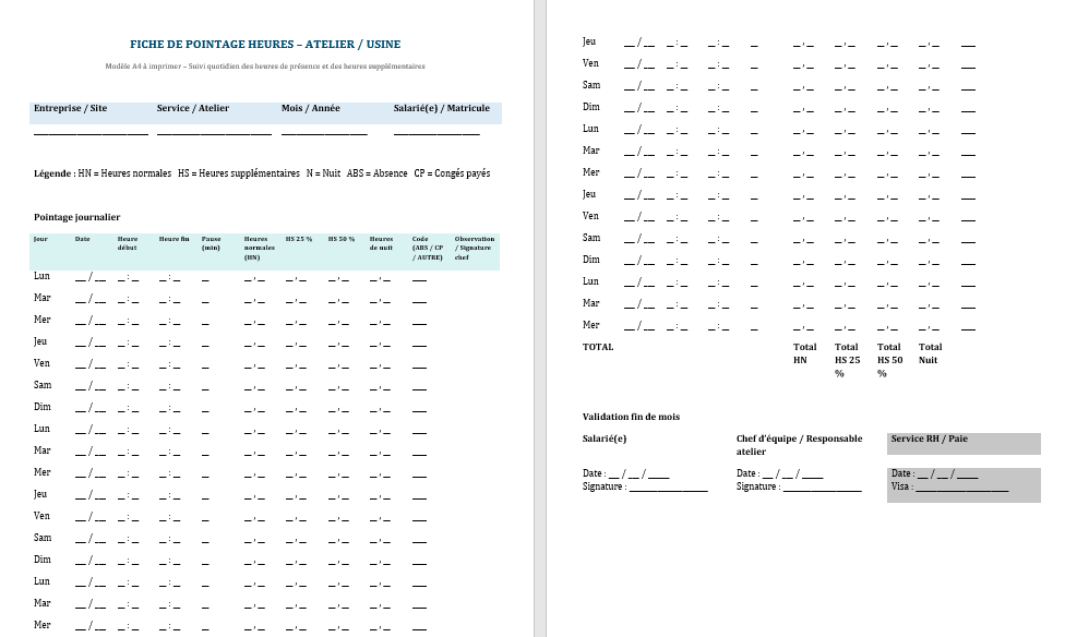 Une fiche de pointage bien pensée permet aussi d’harmoniser les pratiques. Chaque atelier, chaque chef d’équipe, chaque salarié parle le même langage : HN pour les heures normales, HS pour les heures supplémentaires, N pour la nuit, des codes clairs pour les absences ou les congés. Le document crée un référentiel commun.