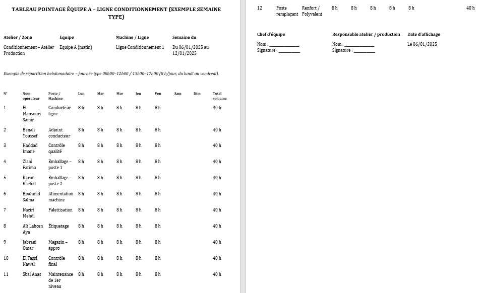 Chaque case journalière peut accueillir un horaire simplifié (8 h, 6 h, 4 h) ou un simple marquage de présence selon le choix de l’usine. Le total hebdomadaire par opérateur permet de vérifier immédiatement si la charge de travail reste cohérente.