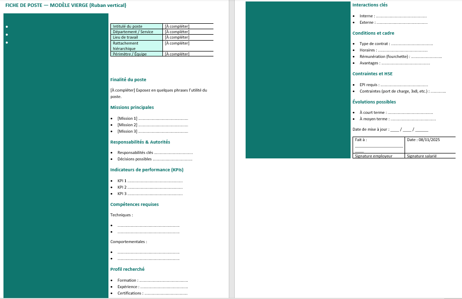 Chaque modèle vierge raconte la même histoire (identité, finalité, missions, KPIs, compétences, profil, interactions, conditions, contraintes/HSE, évolutions), mais change d’angle visuel. Cette pluralité sert vos usages : un atelier privilégie les repères francs, un service marketing assume la couleur, une PME en audit choisit la sobriété.