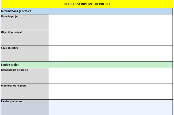 - Fiche de projet : une fois le financement acquis, elle sert à organiser les actions concrètes : recrutement, planning de travaux, calendrier de formation, plan de communication, etc.