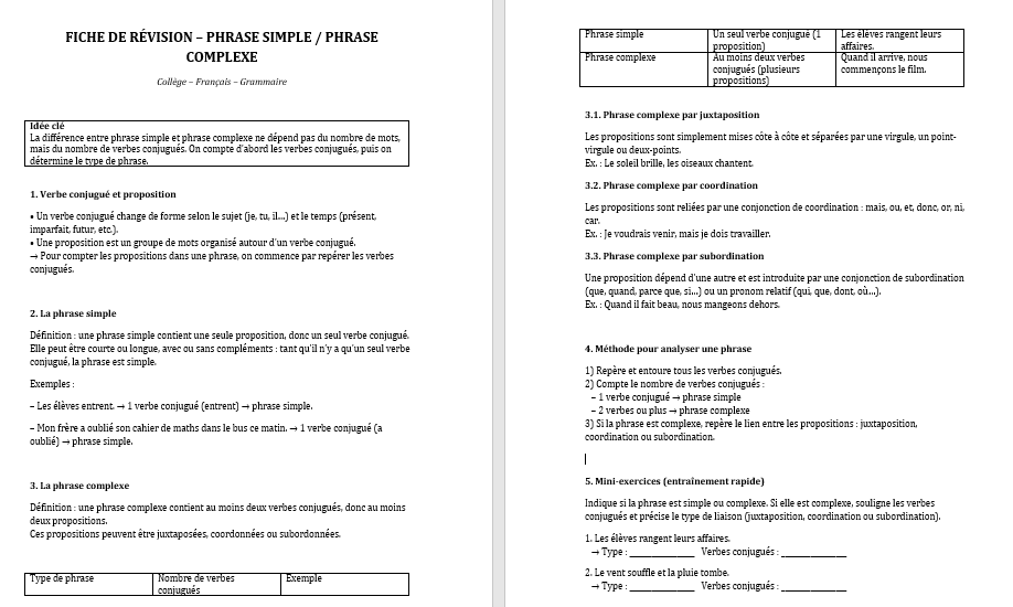 Fiche de révision : Phrase simple / phrase complexe : exercices corrigés