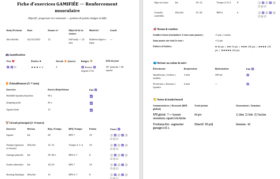 L’échauffement (5–7 min) mobilise les articulations et monte le cardio en douceur : mobilité épaules/hanches, jumping jacks, squats lents. Le circuit principal assemble 6–7 mouvements en 2 à 4 tours, avec colonnes “Niveau”, “Rép./Temps”, “RPE/Tempo”, “Points” et une piste pour cocher les tours. La zone Bonus & combos récompense l’enchaînement sans pause et l’exécution fluide. Enfin, le retour au calme (étirements ciblés + respiration) ferme la boucle et le leaderboard consigne total de points, classement et ressenti.