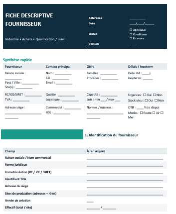 Avant même la première commande, une relation fournisseur se joue souvent sur un point simple : la qualité de l’information. Qui est réellement l’entreprise ? Que fabrique-t-elle, avec quels moyens, quels contrôles, quels délais, quelles garanties ? La fiche descriptive fournisseur répond précisément à cette question. Elle donne une photographie structurée du fournisseur, suffisamment claire pour décider, suffisamment précise pour piloter, et suffisamment “probante” pour sécuriser la conformité (qualité, HSE, traçabilité, réglementation, continuité).