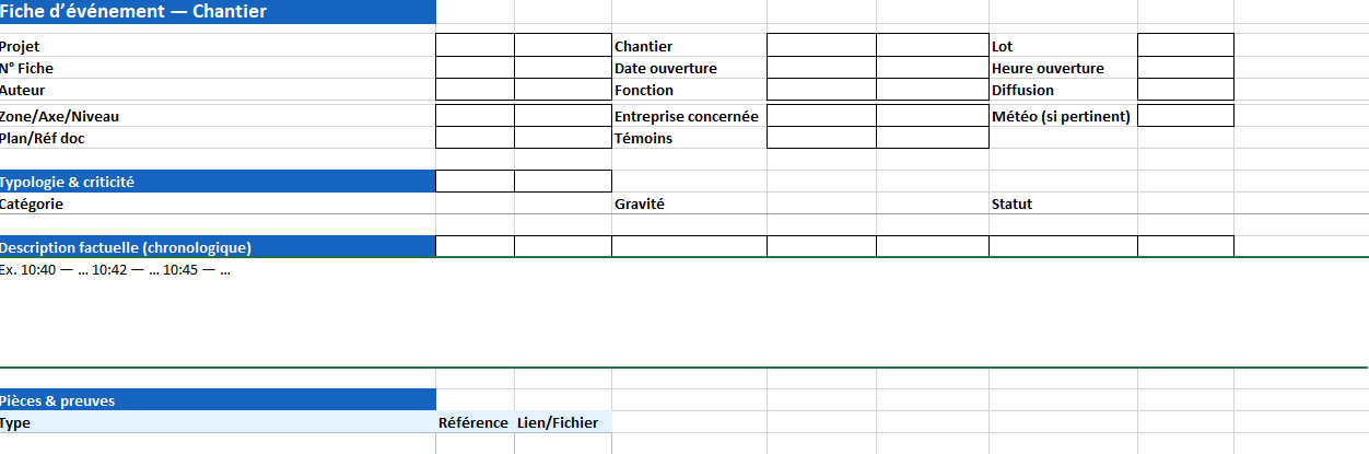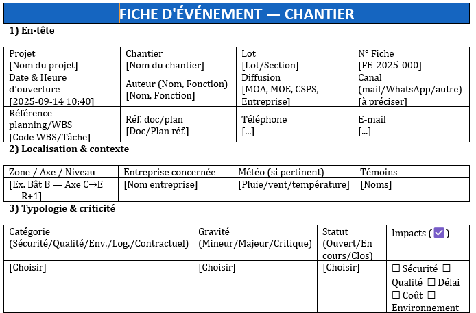 La fiche d’événement est le document “réflexe” pour consigner tout fait notable sur un chantier : sécurité (accident, incident, presqu’accident), qualité (non-conformité, reprise), environnement (déversement, nuisance), logistique/production (panne, retard), contractuel (instruction verbale, blocage). Cette fiche transforme un fait isolé en apprentissage collectif et en preuve opposable si besoin.