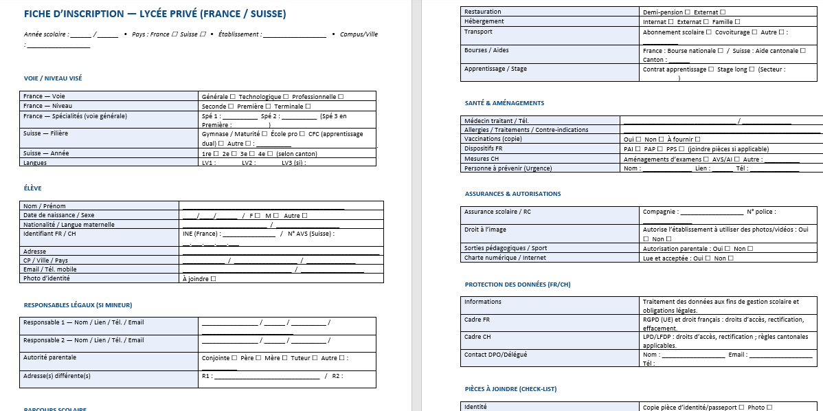 Frais de scolarité, options (restauration, internat, activités), modalités de paiement (carte/virement/échelonné), bourses (FR) / aides cantonales (CH), échéances, pénalités de retard, IBAN/BIC. - Pièces à joindre (check-list)