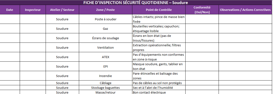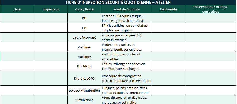 Télécharger un modèle Excel Fiche d’Inspection Sécurité Quotidienne d’Atelier ⬇️