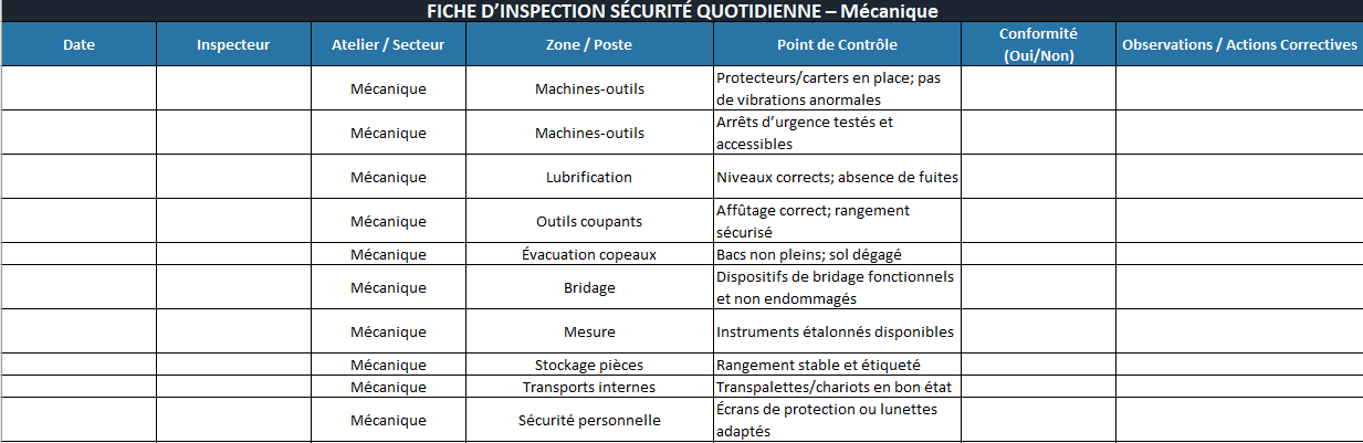 Ci-après une décomposition détaillée des critères d’inspection quotidienne, adaptée selon plusieurs types d’ateliers.