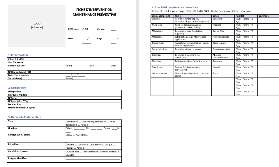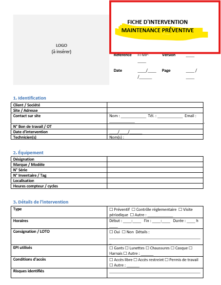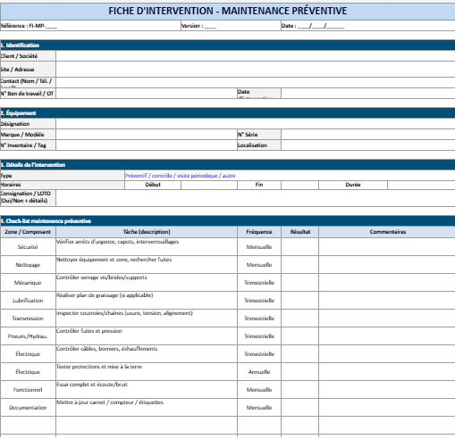 Fiche d’intervention de maintenance préventive : Modèle Word et Excel