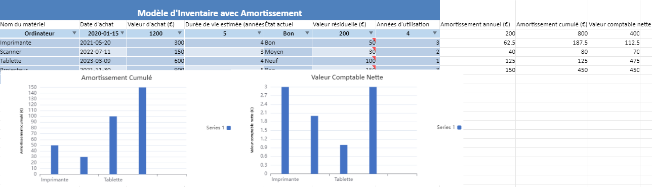 Le modèle d’inventaire avec amortissement est un outil puissant conçu pour suivre la dépréciation des actifs matériels au fil du temps. Il permet non seulement de gérer l’inventaire des équipements ou matériels d’une entreprise, mais aussi de calculer et de visualiser l’amortissement annuel et cumulé, ainsi que la valeur comptable nette de chaque élément.