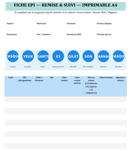 - Archiver la fiche au dossier HSE / magasin, avec copie terrain si la durée d’affectation dépasse quelques jours.