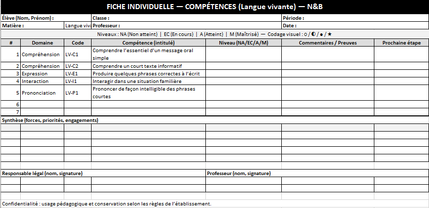 - Limiter la fiche à 10–12 compétences prioritaires par période (trimestre/semestre).