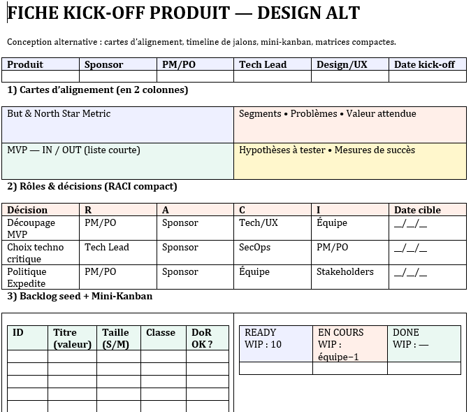 Télécharger deux modèles Word – Fiche Kick-off Produit (MVP, DoR/DoD, SLE, jalons)⬇️