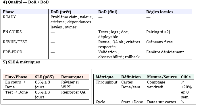 - Fixer la qualité (DoR/DoD), les attentes de service (SLE), et des jalons datés.