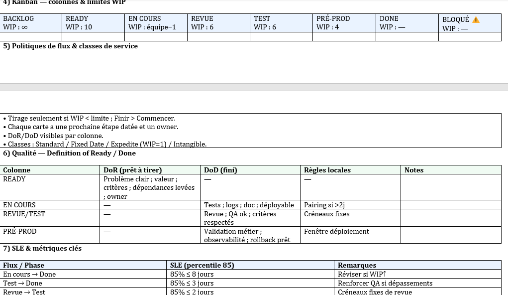 - D+7 : si le throughput est stable et le WIP respecté, migre vers l’outil de gestion (Jira/Trello/Linear/Notion) en reprenant les mêmes colonnes, WIP et politiques. La fiche reste le document de cadrage (référence “v1.x”).