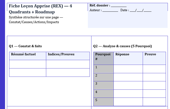 Fiche « Leçon Apprise (REX) » — 4 Quadrants + Roadmap : Modèle Word et Excel
