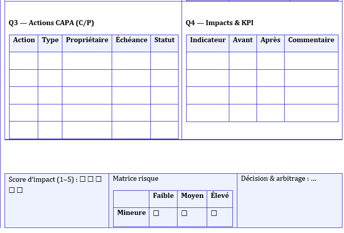- 15 min — Quadrant 3 : 5 Why/Ishikawa sur 2 causes majeures + signaux faibles.