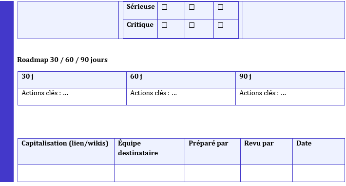 - Lier chaque décision à une mesure et un jalon (D+7, D+30, D+90).