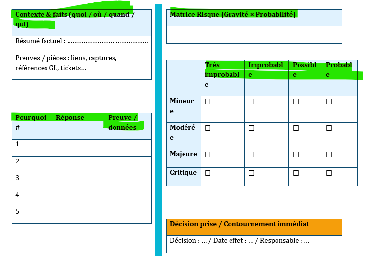 - Préparez la timeline factuelle (dates, volumes, incidents), les KPI clés (délai, qualité, coût, satisfaction), et 2–3 échantillons de données (tickets, pareto, journaux de lot).