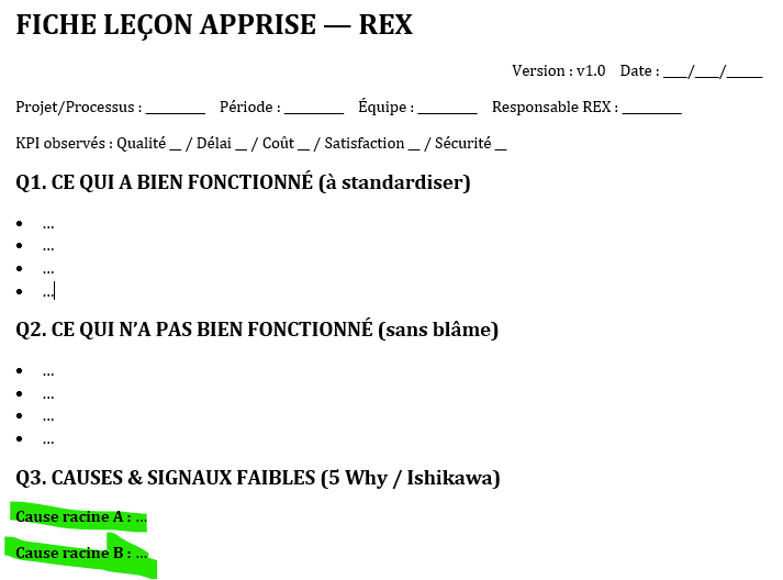 - Diffusez la fiche (PDF/Confluence/SharePoint), loguez-la dans le registre REX et reliez-la aux standards (SOP, checklists, formations).