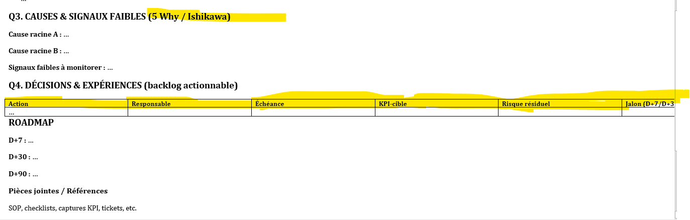Ex. « Cause racine : absence de standard de nommage », « Signal faible : 3 tickets “fichier introuvable” la semaine -2 ». - Décisions et expériences à mener (backlog d’amélioration)
