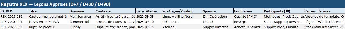 - Qui porte le REX ? Un facilitateur neutre (Qualité/PMO) qui cadence et protège la parole.