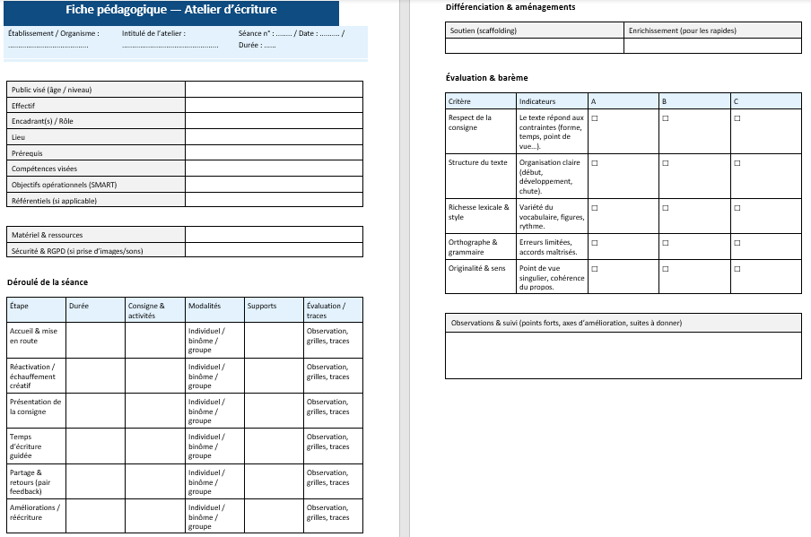 Une fiche pédagogique élaborée transforme un atelier d’écriture en dispositif précis, mesurable et motivant. En réalité, cette fiche clarifie les objectifs, cadre la séance, facilite la différenciation et rend l’évaluation plus transparente. Ci-dessous un guide complet pour bâtir et animer vos ateliers, accompagné d’un modèle Word structuré et prêt à remplir.