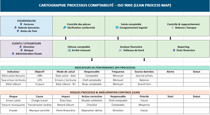 Derrière l’apparente rigueur des chiffres, la comptabilité suit en réalité un chemin très concret, fait de documents reçus, de vérifications, de saisies, de contrôles et de restitutions. La fiche processus comptabilité ISO 9001 permet justement de rendre ce parcours visible. Sur une seule vue, elle aide à comprendre comment l’information circule, où se situent les points de vigilance, qui intervient à chaque étape et comment le processus reste maîtrisé dans une logique de qualité. Lorsqu’elle prend une forme visuelle, claire et structurée, elle devient bien plus qu’un support d’audit : un véritable outil de pilotage au quotidien.