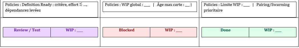 - WIP par colonne (max) : Ready = __ | In Progress = __ | Review/Test = __