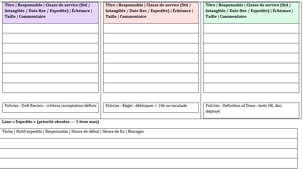 - Définir DoR/DoD et règles d’Expedite (écrit, visible, accepté).