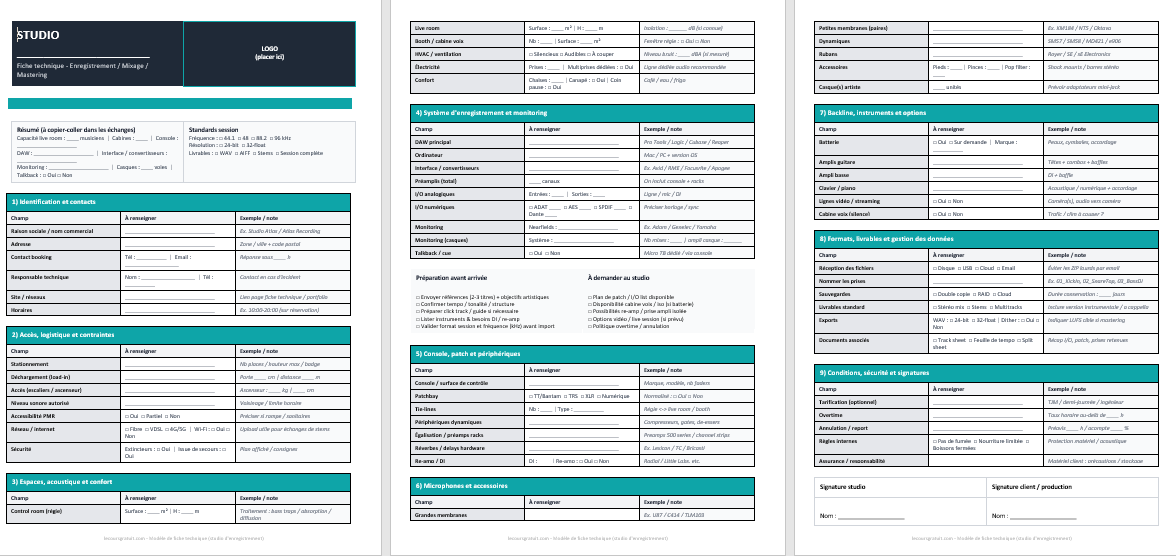 Pensez “modulaire” : une fiche de base, plus des annexes selon le type de projet (podcast, musique live, post-prod).