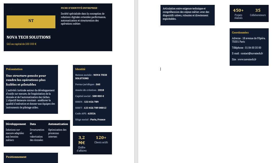 La fiche d’identité répond à une nécessité concrète : donner à voir rapidement une organisation sans imposer une lecture longue. Elle facilite les échanges, clarifie le positionnement et sert de point d’appui dans des situations où le temps d’analyse reste limité.