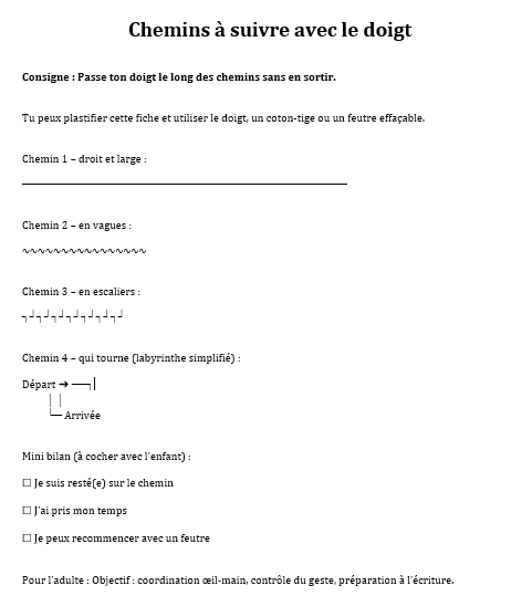 Cette fiche peut servir de première étape avant l’utilisation de crayons ou de feutres. L’adulte peut d’abord inviter l’enfant à parcourir les chemins uniquement avec son doigt, puis proposer de recommencer avec un coton-tige trempé dans de la peinture ou avec un feutre effaçable sur une version plastifiée. L’enjeu n’est pas de “colorier vite”, mais de prendre le temps, de respirer, de se concentrer, de recommencer si besoin. La petite zone de “bilan” en bas de la fiche permet à l’enfant de se situer : il peut cocher s’il est resté sur le chemin, s’il a pris son temps, s’il se sent prêt à essayer avec un outil scripteur.