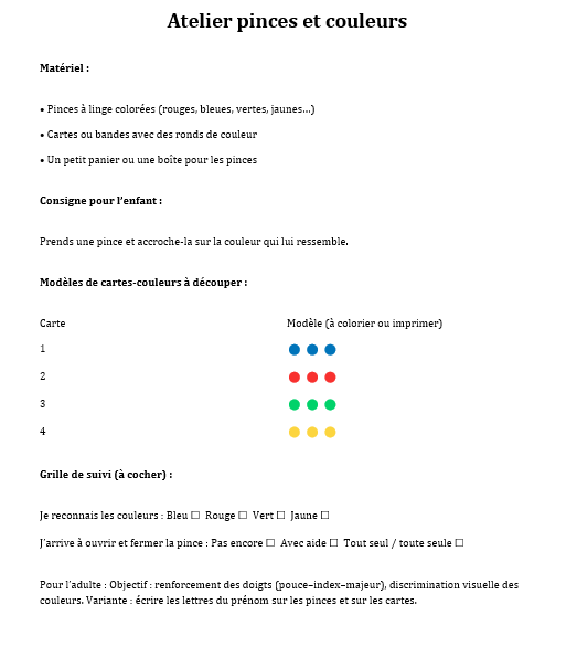 L’intérêt de cette fiche est double. Sur le plan moteur, l’ouverture et la fermeture de la pince font travailler des muscles souvent peu sollicités au quotidien. Sur le plan cognitif, l’enfant doit reconnaître, comparer, classer les couleurs. L’adulte peut complexifier la tâche en ajoutant davantage de cartes, en introduisant de nouvelles nuances, ou en remplaçant les couleurs par des lettres, des chiffres, des formes. La grille de suivi, intégrée à la fiche, invite à observer si l’enfant reconnaît chaque couleur et s’il parvient à manipuler la pince seul ou avec aide : c’est un support discret d’évaluation et de dialogue.