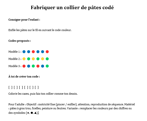 La troisième fiche propose de fabriquer un collier de pâtes en suivant un code couleur. L’enfant découvre des modèles simples : deux pâtes bleues, une rouge, à répéter ; alternance de jaune et de vert ; séquence rouge–bleu–vert. Il est invité à reproduire ces codes, puis à inventer le sien, en coloriant des cases sur la fiche avant de se lancer dans l’enfilage.