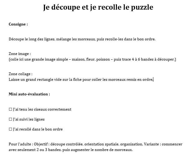 Cette fiche permet d’observer plusieurs choses à la fois. Le geste de découpe montre comment l’enfant tient ses ciseaux, s’il avance régulièrement, s’il suit la ligne ou s’il s’en éloigne. Le moment du collage révèle son sens de l’orientation spatiale : replacer un morceau à l’endroit, reconnaître le haut et le bas, reconstituer une continuité. L’adulte peut réduire la difficulté en commençant par deux ou trois bandes seulement, puis augmenter progressivement le nombre de morceaux. La petite auto-évaluation en bas de la fiche invite l’enfant à regarder son propre geste : a-t-il tenu les ciseaux correctement, a-t-il suivi la ligne, a-t-il réussi à recomposer l’image ?