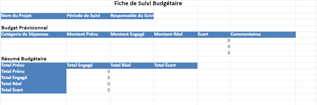 - Description : Elle détaille les coûts prévus et réels, ainsi que les écarts budgétaires. Cette fiche est cruciale pour la gestion financière du projet et pour garantir que le projet reste dans les limites budgétaires définies.