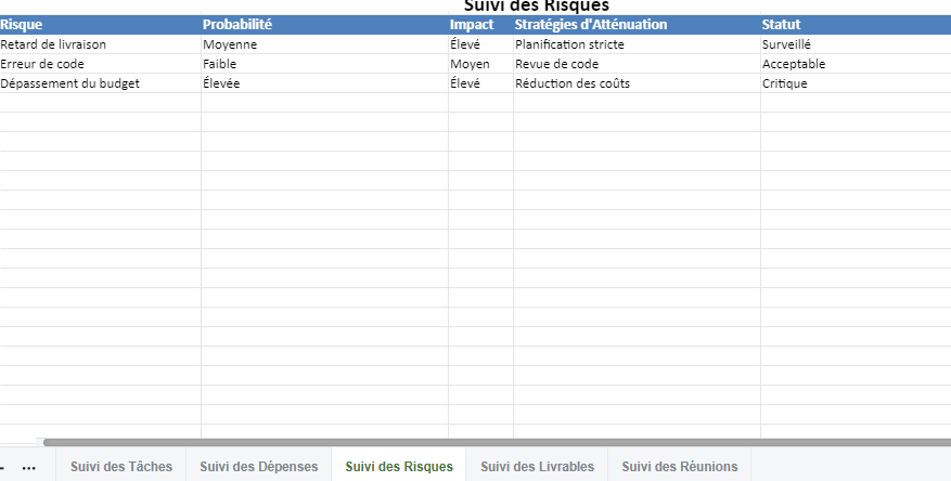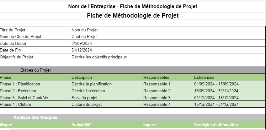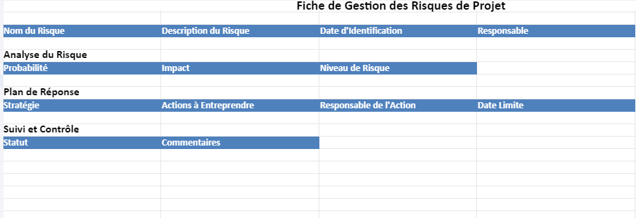 - Description : Cette fiche identifie les risques potentiels associés au projet, évalue leur impact, et propose des mesures de mitigation. Elle est essentielle pour anticiper les problèmes et ajuster la planification en conséquence.