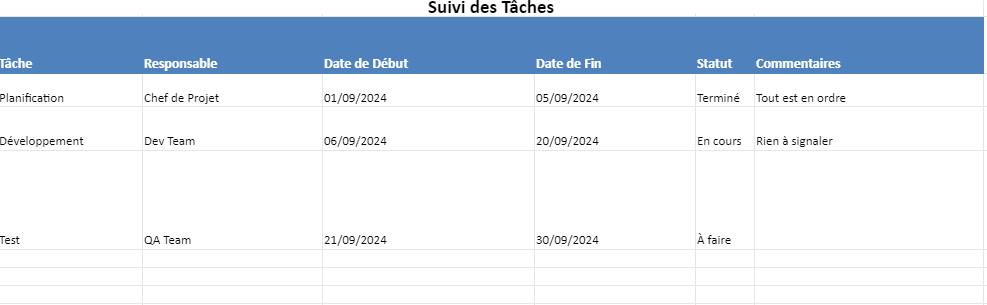 - Description : Utilisée pour suivre l’évolution du projet par rapport au plan initial. Elle peut inclure des indicateurs d’avancement, des rapports de progression, et des alertes sur les écarts éventuels.