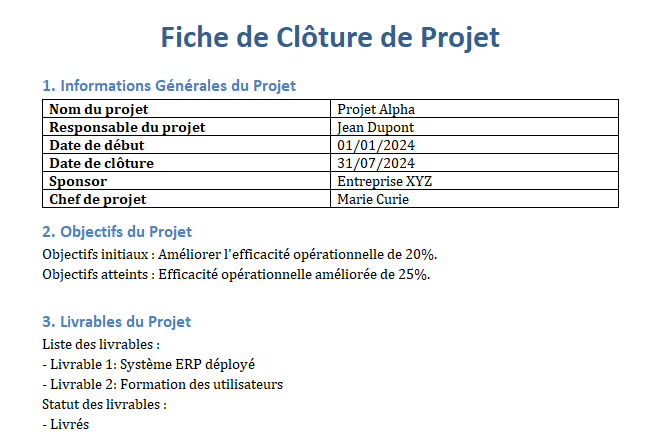 - Description : Documente la finalisation du projet, y compris la validation des livrables, la libération des ressources, et l’évaluation finale. Cette fiche est essentielle pour officialiser la fin du projet et archiver les informations pertinentes.