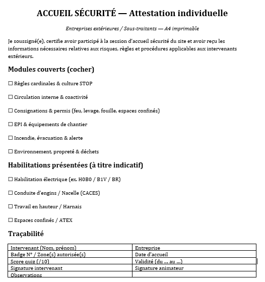Fiches imprimables (A4) pour l’Accueil Sécurité — Entreprises extérieures / Sous-traitants
