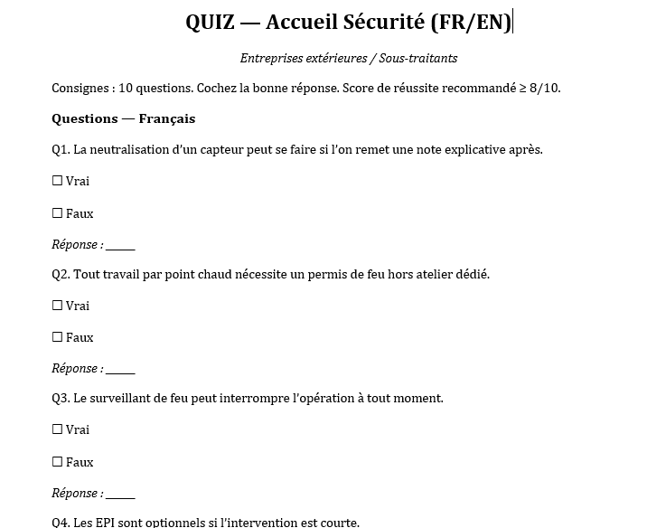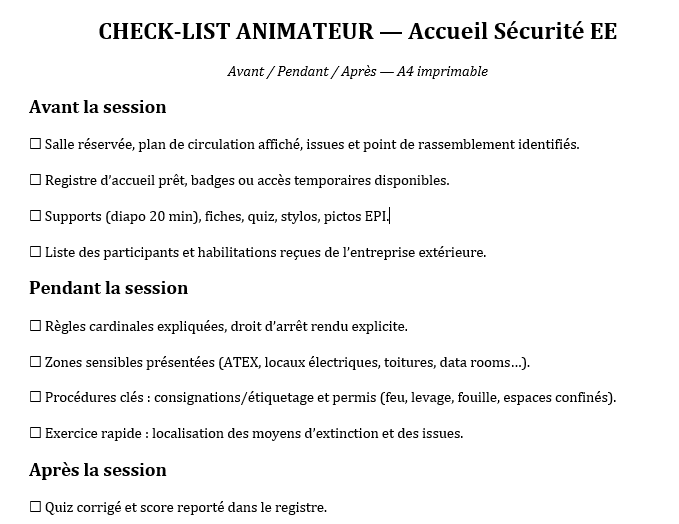 La Fiche “Règles essentielles” pose le socle visible du site (règles cardinales, circulation, EPI, évacuation, propreté). L’Attestation individuelle formalise l’engagement. Le Quiz FR/EN vérifie l’appropriation. La Check-list Animateur sécurise le déroulé. Le Registre Excel constitue l’ossature de preuve et le tableau de bord (validations, feux tricolores, onglet checklist, banque de questions).