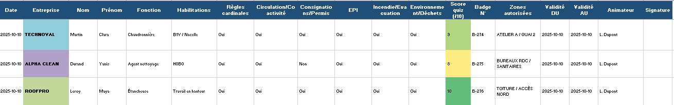 Feuille d’émargement avec identité, entreprise, date, durée, animateur. Score du quiz éclair (5–10 questions). Numéro de badge, zone d’accès autorisée, validité. Liens avec le plan de prévention/PPSPS, liste des permis délivrés, écarts et actions correctives.