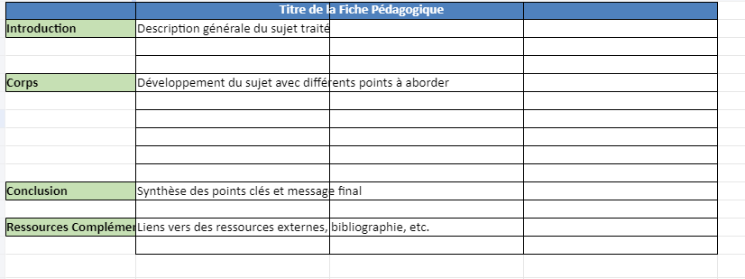Les fiches pédagogiques suivent généralement une structure cohérente pour assurer une présentation efficace des informations. Voici les éléments clés d’une structure typique :