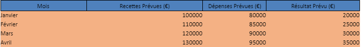 | Mois | Recettes Prévues (€) | Dépenses Prévues (€) | Résultat Prévu (€) |