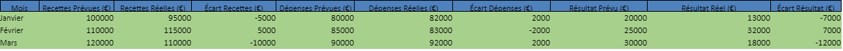 - Gain de temps : Les formules automatiques calculent les écarts entre les prévisions et les résultats réels, évitant les erreurs manuelles.