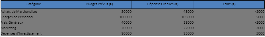 | Catégorie | Budget Prévus (€) | Dépenses Réelles (€) | Écart (€) |