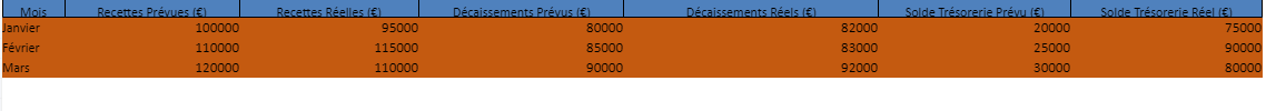 | Mois | Recettes Prévues (€) | Recettes Réelles (€) | Décaissements Prévus (€) | Décaissements Réels (€) | Solde Trésorerie Prévu (€) | Solde Trésorerie Réel (€) |