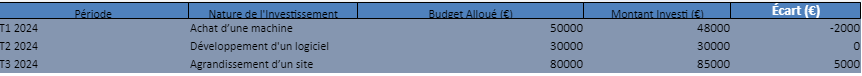 | Période | Nature de l’Investissement | Budget Alloué (€) | Montant Investi (€) | Écart (€) |