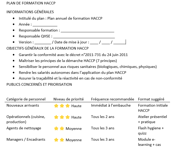| Intitulé | Plan de formation HACCP annuel/pluriannuel |